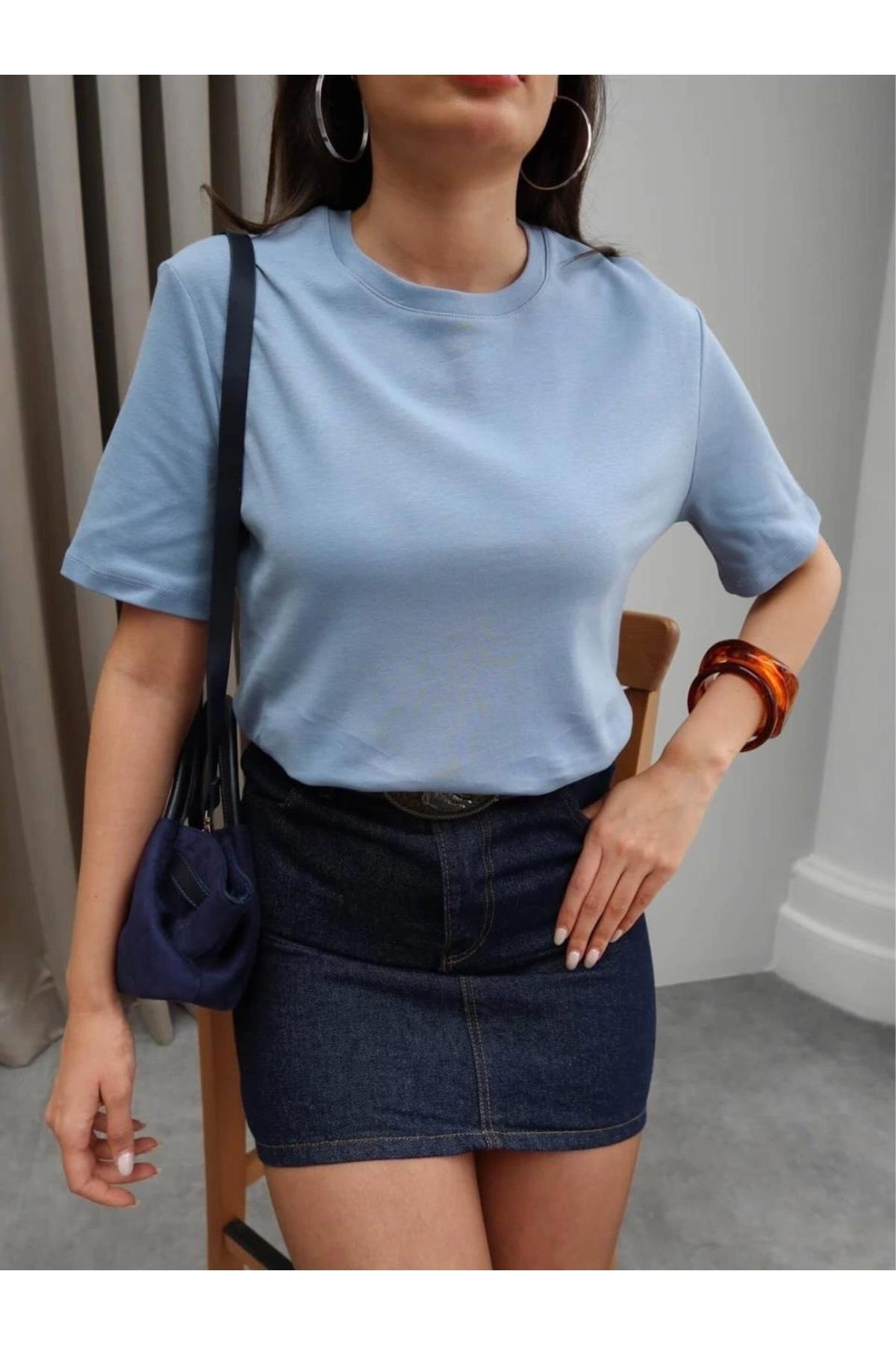 %100 Pamuk Bisiklet Yaka Basic Bebe Mavisi Kadın T-shirt