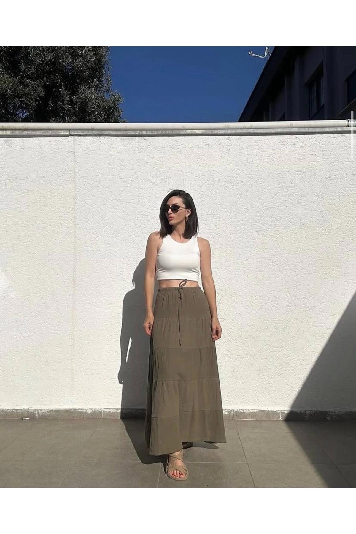 Astarlı Haki Katlı Uzun Etek