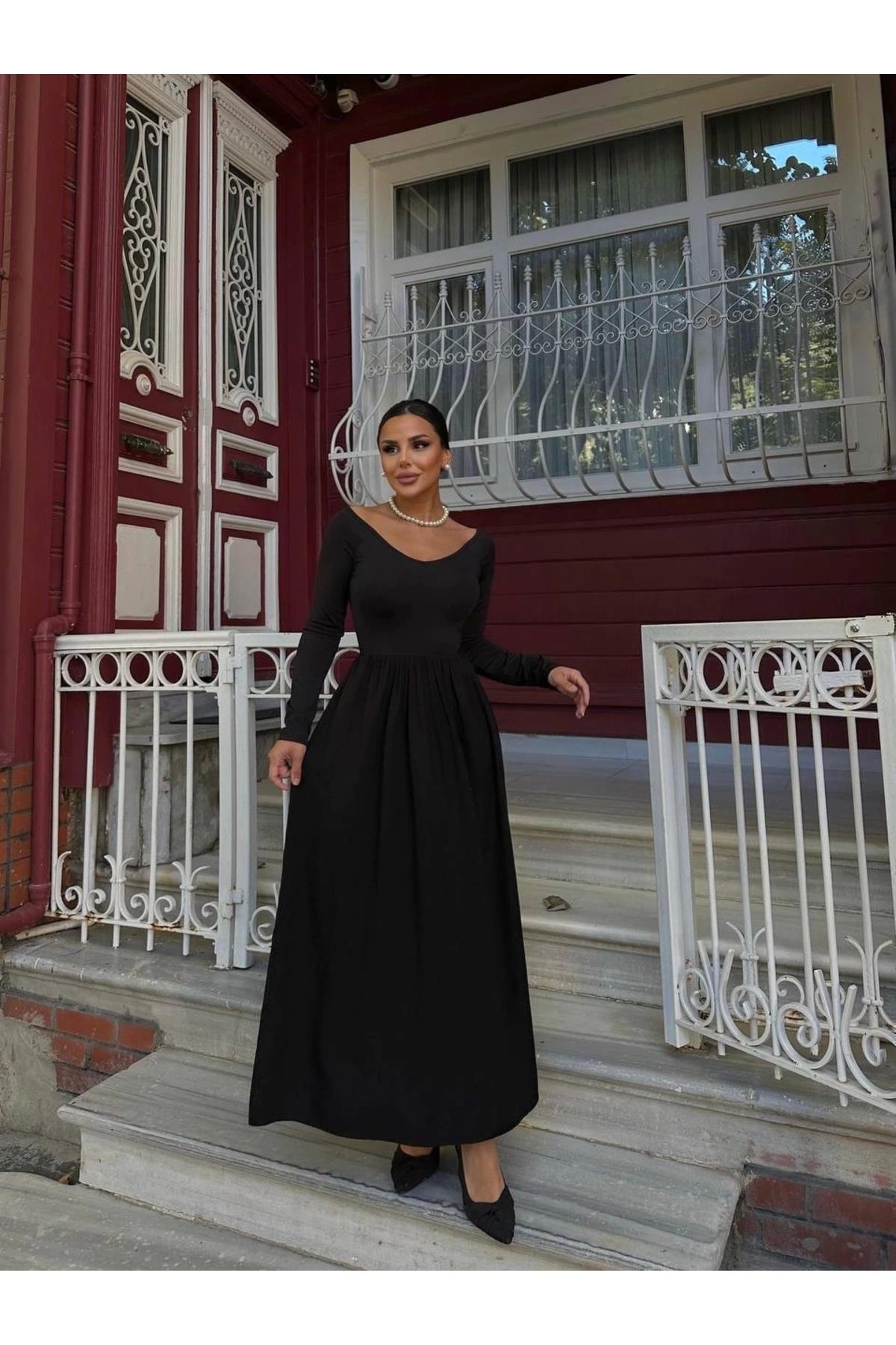 Dalgıç Kumaş Eteği Genişleyen Siyah Kadın Elbise