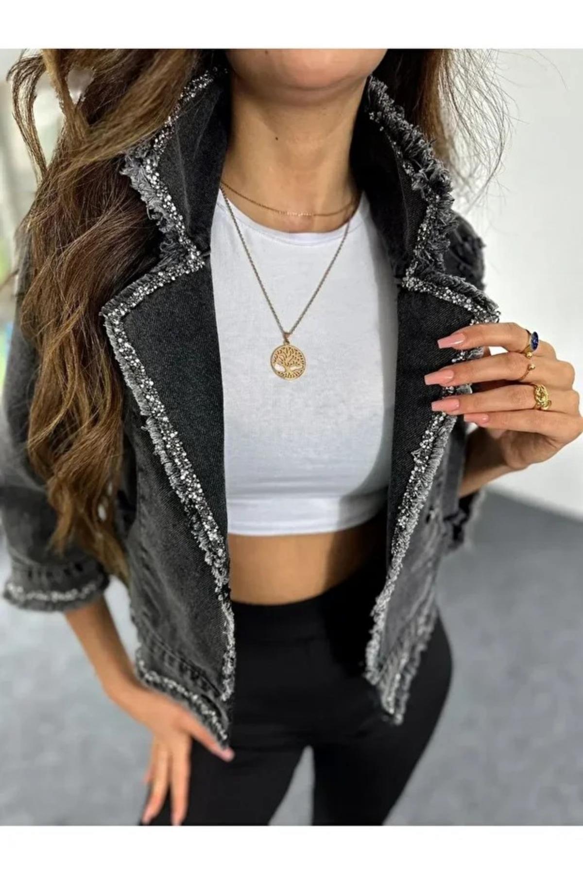Fakir Kol Püsküllü Taş İşlemeli Yırtık Detaylı Kadın Ceket