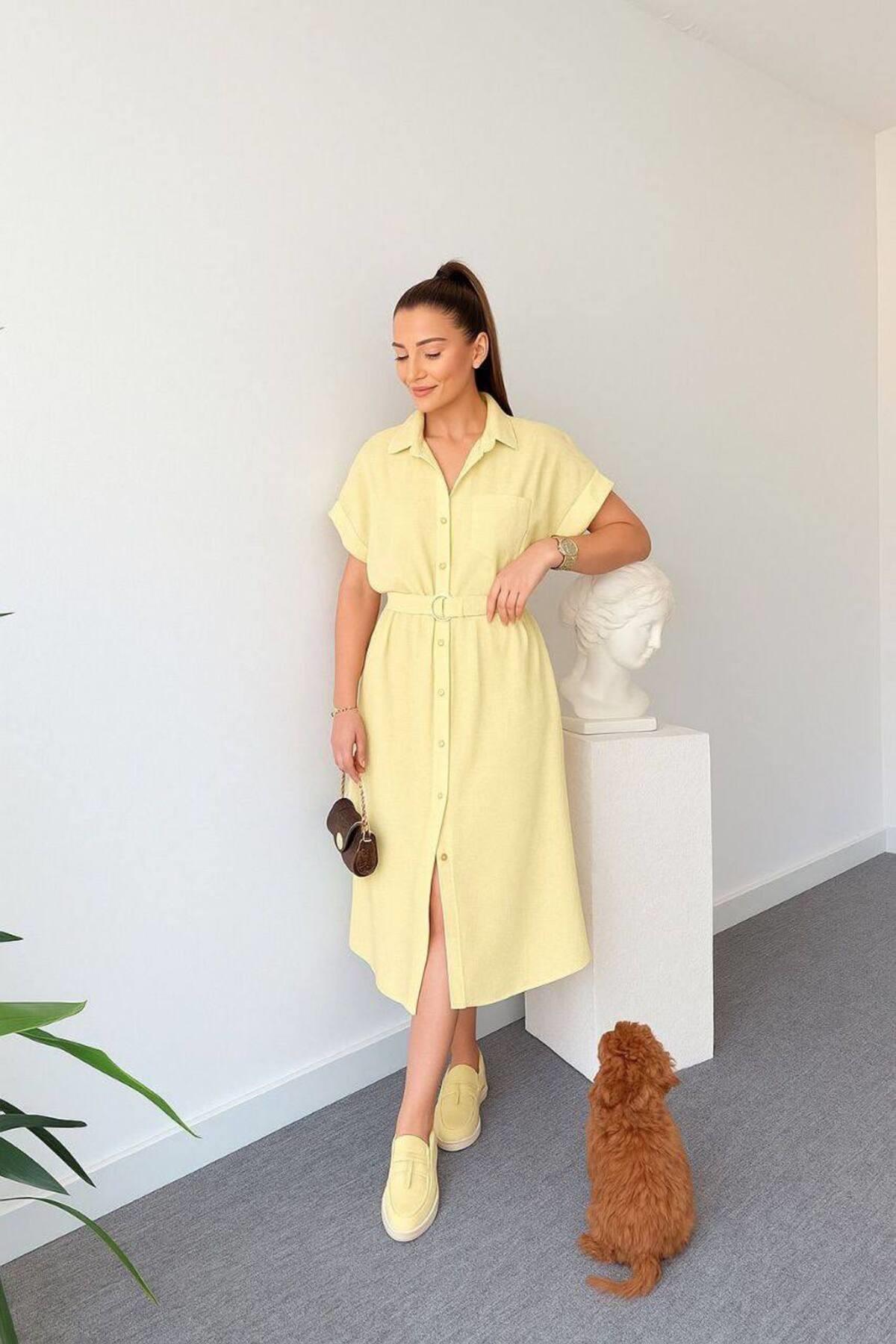 - Canlı sarı rengiyle dikkat çeken bu gömlek elbise, yaz aylarının enerjisini yansıtır.; - Tekli paket içeriği ile kolay kullanım sunar ve pratik bir seçimdir.; - Düz dokuma kumaşı sayesinde rahatlıkla günlük veya özel günlerde tercih edilebilir.; - Pratik düğme kapama şekli ile hızlıca giyilip çıkartılabilir; zamandan tasarruf sağlar.; - %100 polyester materyal bileşeni, dayanıklılığı artırırken hafifliği korur.; - Türkiye menşeli olmasıyla yerel üretim kalitesine sahiptir.; - Düşük kol tasarımı modern ve şık bir görünüm kazandırırken, kısa kol boyu serin tutar.; - Gömlek kesimiyle hem rahat hareket etme imkanı sunar hem de zarif bir siluet oluşturur.; - Midi boyu ile hem günlük kullanım hem de özel davetler için idealdir.; - İç göstermeyen yapısı sayesinde konforlu bir deneyim yaşatır.; - Orta kalınlığındaki kumaşı mevsim geçişlerinde ideal sıcaklık dengesi sağlar.; - Dokuma kumaş tipi dayanıklılığı arttırarak uzun süreli kullanım vaad eder.; - Kap kısmında kemer detayı bel bölgesini vurgulayarak feminen bir duruş katmaktadır.; - Zarif koleksiyon parçası olarak gardrobunuzda şıklığınızı tamamlar.; - Basic siluetiyle her türden aksesuarla kombinlenebilirlik sunar.; - Trend ortamlarda fark yaratmanız için mükemmel bir seçenektir.; - Baskısız deseniyle sadelikten yana olanların tercihi olacak şekilde tasarlanmıştır.; - Astarsız oluşu hafiflik hissi verirken aynı zamanda minimalist tasarım anlayışını destekler.; - Trend ortamlara uygun olarak stil sahibi kadınların beğenisine sunulmuştur.; - Kemer detaylı tasarım bel çevresini sıkılaştırarak daha fit bir görünüm sağlar.; - Maksimum 30 derecede yıkama talimatına uyarak ürününüzü ilk günkü gibi koruyabilirsiniz.; - Polyester malzemesinin sunduğu kolay bakım avantajlarıyla zamandan tasarruf edersiniz.; - Yetişkin beden ölçülerine uygun olarak üretilmiştir; standart beden seçeneğiyle herkes için erişilebilirdir.