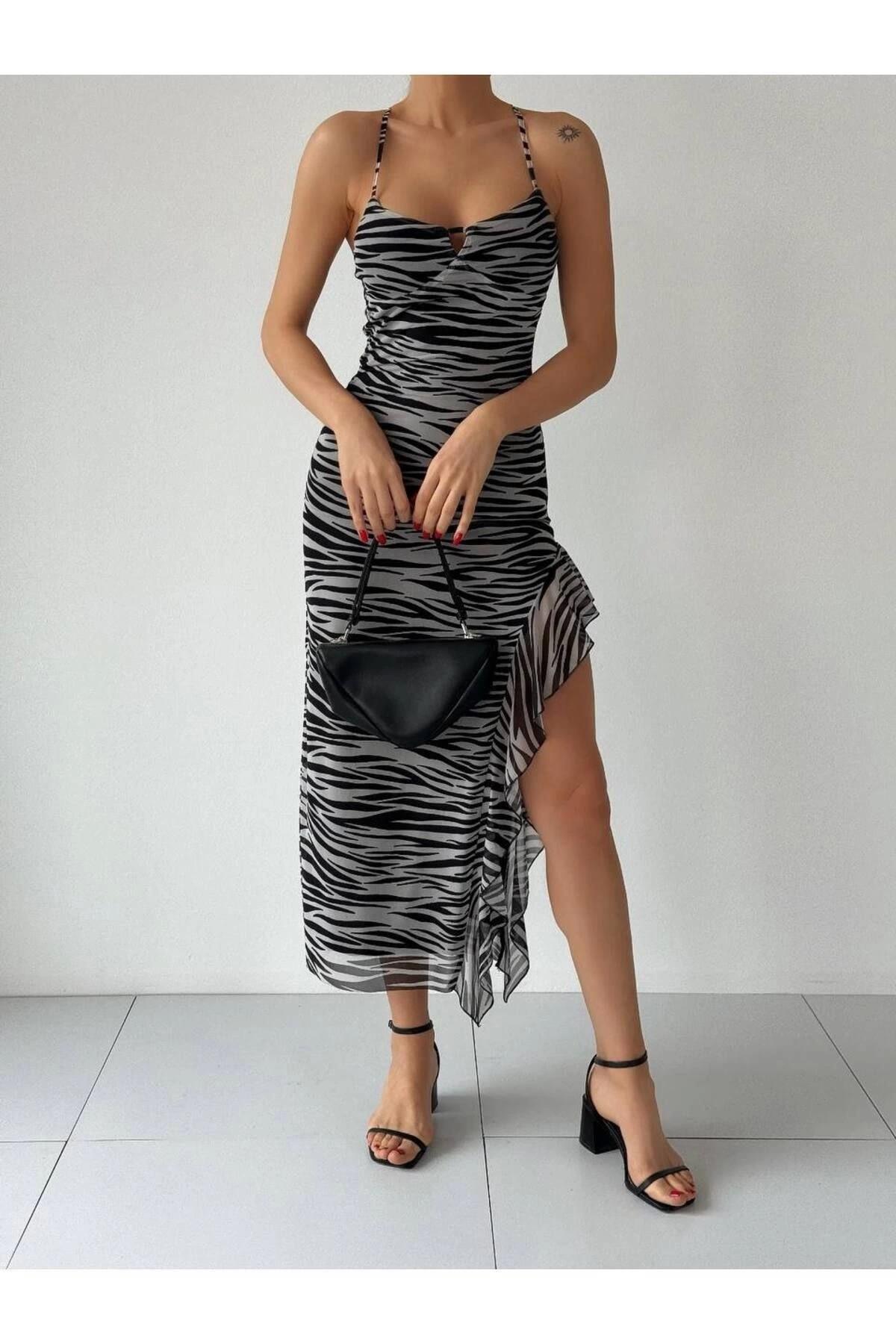 Zebra Desenli Yırtmaçlı Tül Elbise
